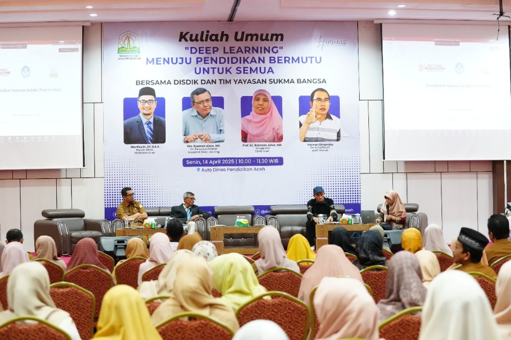 Kepala Dinas Pendidikan Aceh, Marthunis, dalam kuliah umum bersama Yayasan Sukma Bangsa, menegaskan kembali komitmen Pemerintah Aceh untuk menghadirkan pendidikan bermutu bagi seluruh siswa SMA/SMK melalui pendekatan deep learning dan pemanfaatan teknologi pendidikan.