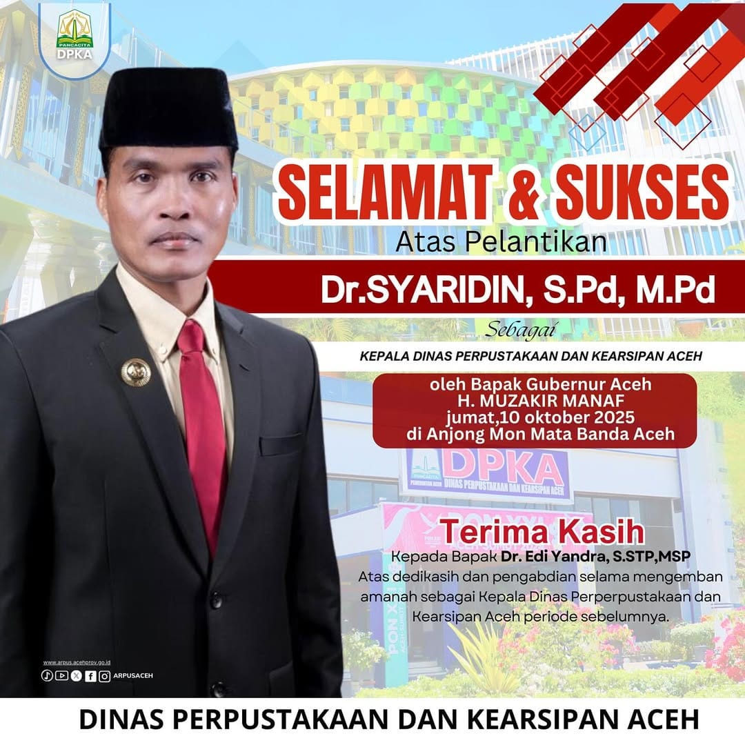IKLAN DPKA – UCAPAN SELAMAT DAN SUKSES ATAS PELANTIKAN Dr. SYARIDI, S.Pd, M.Pd SEBAGAI KEPALA DINAS PERPUSTAKAAN DAN KEARSIPAN ACEH